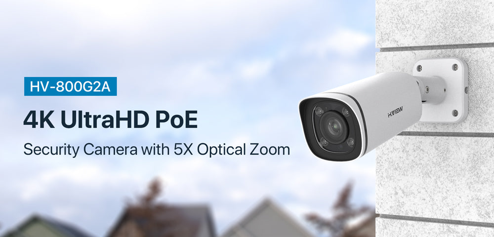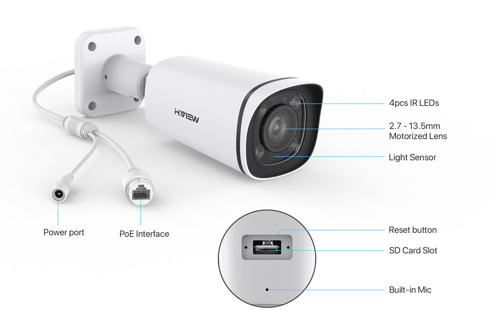 H.VIEW 4K (8MP) 5× Optical Zoom Outdoor Security Camera, Built-in SD Card Slot, 3840x2160, Audio, H.265, 100ft Night Vision, IP67 Waterproof IP Bullet PoE Camera, AI Detection