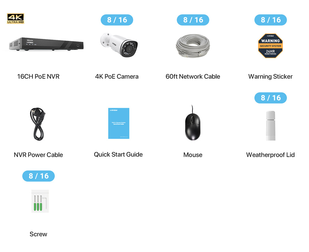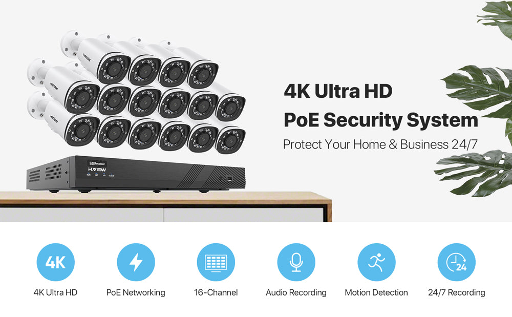 H.View 4K (8MP) Ultra HD 16-Kanäle PoE-Sicherheitssystem mit Audiokalzkameras