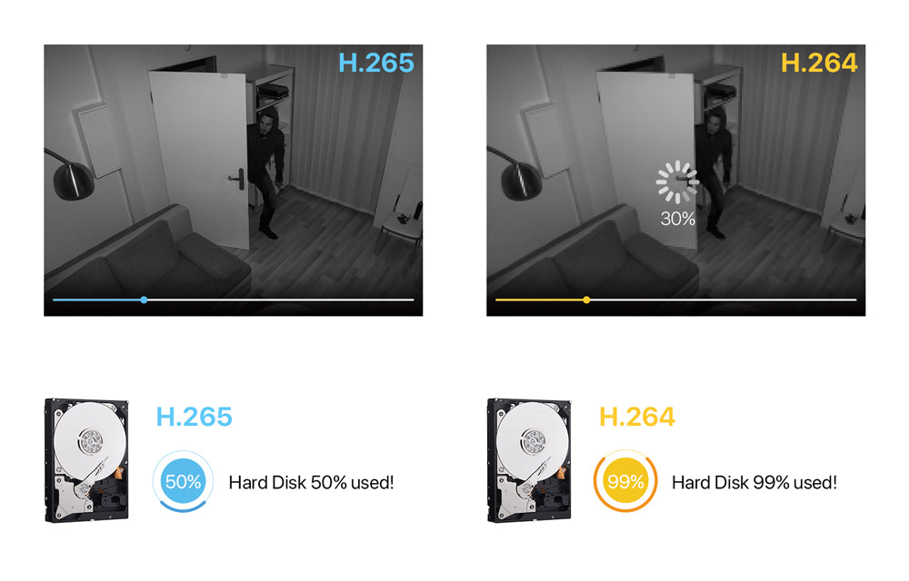 H.265 Aufnahmekomprimierungssatz 40-50% mehr Video als H.264 auf derselben Festplatte. H.265 kann die Netzwerkleistung für die Remote-Anzeige verbessern. Die.265-Technologie komprimiert Ihr Video, ohne eine der Ultrahd-Videoqualität zu beeinträchtigen.