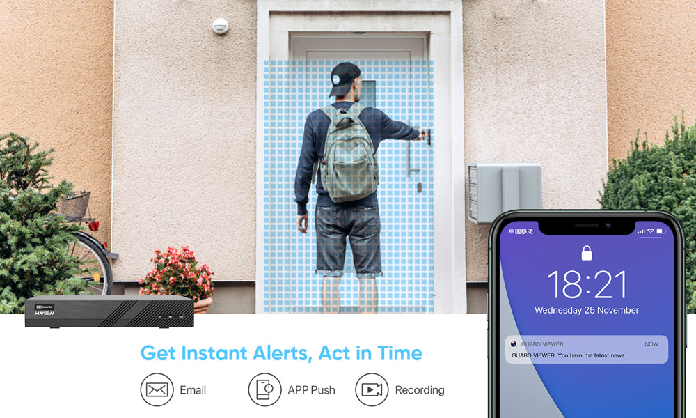 Dieses 4K 8MP-Sicherheitssystem kann Bewegung erkennen und Sie sofort über Push-Benachrichtigungen informieren, E-Mail-Benachrichtigungen. Sie können alle Arten von Alarme an Ihre Bedürfnisse personalisieren.