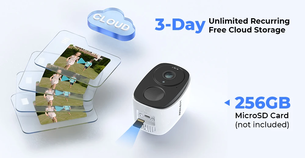 The camera supports a MicroSD card of up to 256GB (memory card not included), and can be used for 3 days of unlimited loop video cloud storage for free.