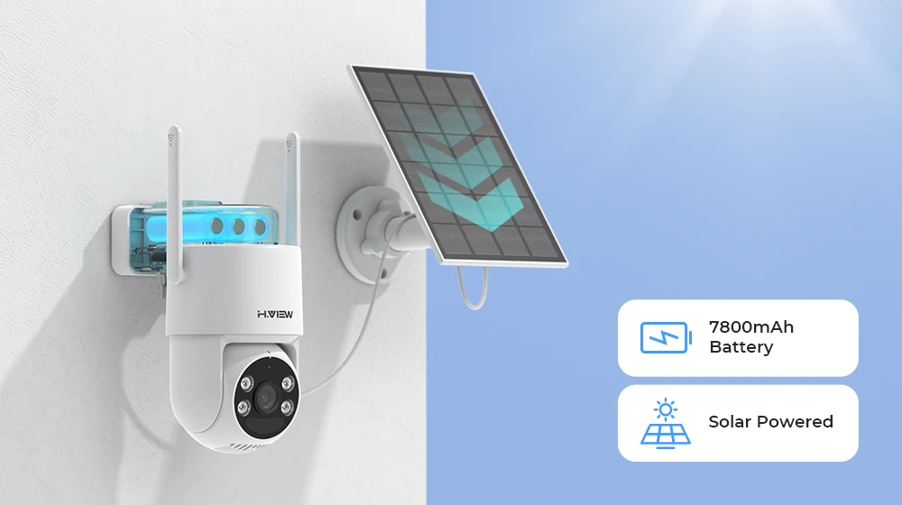 The H.VIEW solar camera has a built-in 7800mAh battery and solar panels, allowing it to maintain continuous electricity for 365 days. It can be charged during the day with the sun and use the battery power during the night to protect your family's safety.