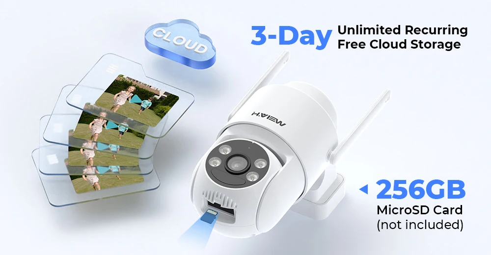 The camera supports a MicroSD card of up to 256GB (memory card not included), and can be used for 3 days of unlimited loop video cloud storage for free.