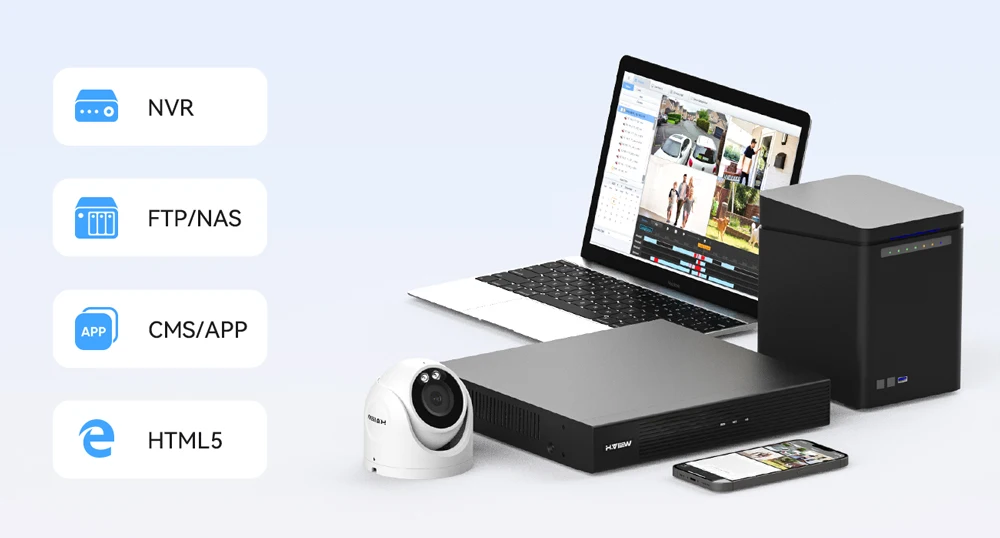 Plug and Play with H.VIEW NVR, come with privacy protocols, well work with Hikvision NVR and Dahua NVR. Save recordings to Synology and QNAP NAS Station.